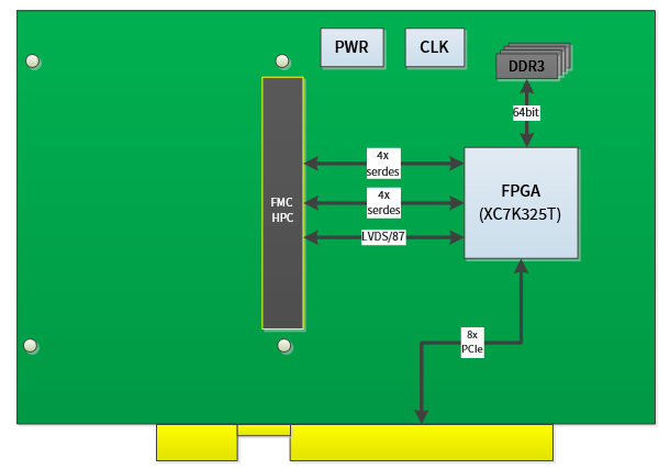 X8 PCIe接口,到FMC连接器有两组4x serdes接口,以及42对LVDS信号